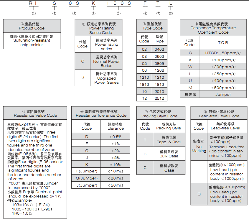1、RH:抗硫化厚膜貼片電阻的產(chǎn)品代號(hào);