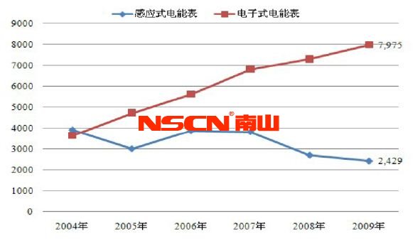據中國儀器儀表行業協會電工 儀器儀表分會統計,2005年電子式電能表產量達4,725萬臺,首次超過感應式電能表產量,使我國電能表生產實現了從量變到質變的飛躍發展,在隨后的幾 年中,電子式電能表在電能表產品中的占比呈現持續增長的良好態勢。2004年至2009年我國電能表產品結構變化情況如下圖: