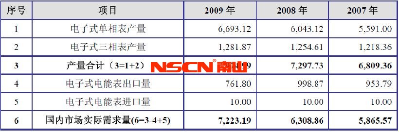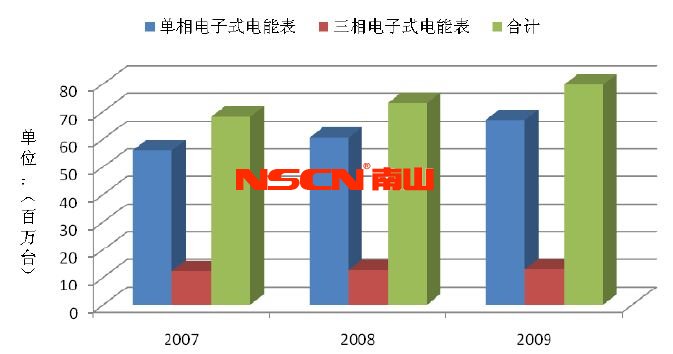 2007-2009年我國電 子式電能表產量分別為6,809.36萬臺、7,297.73萬臺、7,974.99萬臺,2008年同比增長7.17%,2009年同比增長 9.28%,其中,單相電子式電能表2008年同比增長8.09%,2009年同比增長10.76%,電子式電能表市場需求總體呈現持續增長的良好態勢。