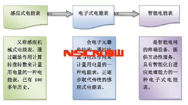 電工儀器儀表行業總體屬于完 全競爭行業。電能表作為電工儀器儀表中的一個重要產品,是用于電力系統發電、輸電、變電、配電、用電等各個環節電能計量的法定計量器具。電能表產品的競爭 格局隨著電能表產品本身的升級換代而變化,電能表的發展經歷了感應式電能表、電子式電能表與智能電能表三個階段,如下圖所示: