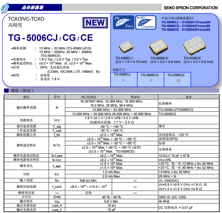 精密的時間是現代通信、導航定位以及計算機自動控制的關鍵和核心,目前主流應用都是采用TCXO溫補晶振來提供。高精度晶振廠商愛普生晶振新推出超小型溫補晶振TG-5006系列TG-5006CJ,TG-5006CG,TG-5006CE。其中每個型號都對應3種版本:VC-TCXO、TCXO和TCXO(具待機功能),可滿足多樣化的用戶需求。低功耗、頻率穩定、小型化的優點讓其適合應用于GPS設計、射頻和無線通信設備(CDMA、WCDMA、LTE、WiMAX)等有高精度和高可靠性要求的設備。那么TG-5006CJ,TG-5006CG,TG-5006CE三種型號該如何識別,三個型號規格參數又有什么區別呢?南山電子幫你具體來分析下,首先我們來看規格書: