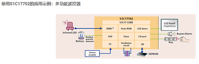 16位微控制器之S1C17000 / 500系列,這是一款低功耗16位微控制器,集成了ROM,RAM,遠(yuǎn)程控制器電路,各種I / F和定時(shí)器功能。它適用于便攜式設(shè)備內(nèi)置的傳感器系統(tǒng)。