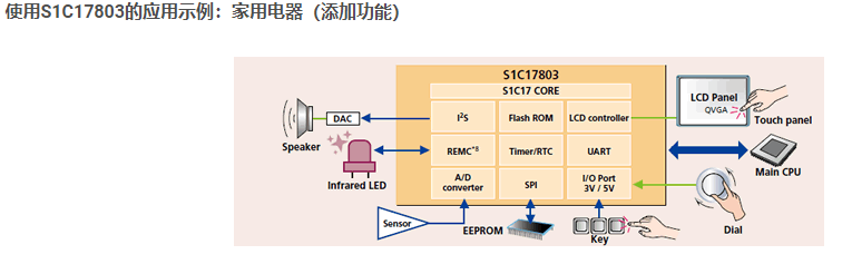 16位微控制器之S1C17800系列:該系列可以在最高48MHz的頻率下實(shí)現(xiàn)與32位微控制器類似的高級(jí)處理。它集成了LCD控制器,USB,A / D轉(zhuǎn)換器和各種I / F,例如SPI,I2C等。它適用于