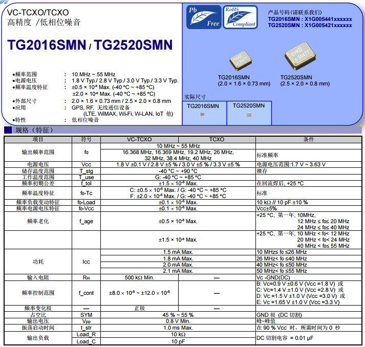 今天給大家介紹溫補晶振TG2016SMN,38.4MHz,MCGNNM,X1G0054410306。低相位噪聲溫補晶振TG2016SMN,是愛普生18年推出的TCXO溫度補償振蕩器。X1G0054410306此款料號對應的頻率為38.4MHz,MCGNNM尺寸大小為2.0X1.6X0.73mm,TG2016SMN具有低相位噪聲,低頻率,溫度穩定性和老化性能。旨在提供卓越的性能。TG2016SMN與TG-5006CG/TG-5006Cj比較大幅度降低了相位噪聲,同時在在電源電壓、負載變化特性方面提升了一倍的性能,由0.2ppm降低到0.1ppm。TG2016SMN與去年熱銷的TG2520SBN與TG2016SBN兩對溫補晶振比較,明顯的差異在于擴大了頻率范圍,最低頻率由13MHz降低到了10MHz這個使用廣泛的頻點。TG2016SMN,38.4MHz,X1G0054410306只是比較熱銷的一種頻點,TG2016SMN常用的頻點還有:40MHz,26MHz,16.368MHz,16.369MHz,19.2MHz,32MHz,48MHz。TG2016SMN為Wi-Fi,GPS,蜂窩,物聯網LPWA和雙向無線電等無線應用提供穩定可靠的通信。下面南山電子就給大家提供TG2016SMN的規格書以供大家選型參考: