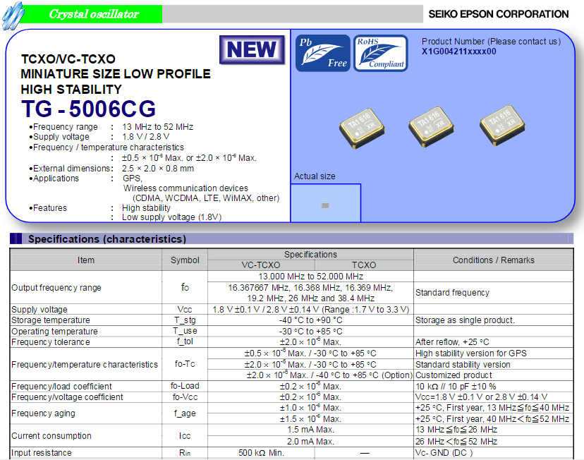 大家好,今天給大家介紹一款適用于GPS模塊晶振TG-5006CG-12H,26MHz,X1G004211000300。此款超小型溫補晶振TG-5006CG-12H,26MHz對應的料號X1G004211000300,尺寸僅為2.5x2.0x0.8mm。TG-5006CG-12H輸出頻率范圍:13~52MHz,頻率公差低至±0.5ppm,振蕩啟動時間2.0ms,工作溫度范圍-30℃~+85℃。極高的溫度穩定性,使TG-5006CG-12H可適用于GPS設備中,同時,TG-5006CG-12H,26MHz作為一款壓控溫度補償晶體振蕩器,可通過溫度補償電路降低由于環境溫度變化導致晶體振蕩器輸出頻率的變化,進一步提升晶體振蕩器輸出頻率的穩定度,X1G004211000300輸出電壓峰峰值為0.8V。該系列初始頻偏為2.0×10-6。此外,溫度帶來的頻率偏差是衡量TCXO溫度補償功能的重要指標。在工作溫度范圍內,本系列在高精度(GPS)條件下的頻率溫度特征僅為0.5×10-6,在標準條件下僅為2.0 ×10-6。TG-5006CG-12H非常適合GPS定位和各類可穿戴設備,并且廣泛應用于GPS、RF、無線通信設備領域。下面南山電子就給大家分享下TG-5006CG-12H,26MHz,X1G004211000300規格書: