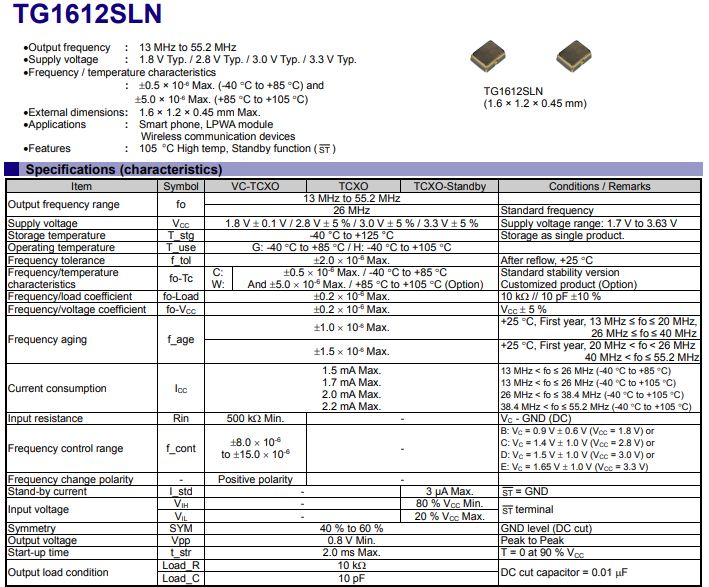 溫度補償晶體振蕩器TG1612SLN使用愛普生開發和制造的IC和MHz基本型晶體,可在105℃溫度環境下工作并具有待機功能。結合小尺寸,高度低、壓力和模制密封阻力的單密封結構的優勢,TG1612SLN物聯網和工業應用的很好選擇。TG1612SLN頻率范圍:13MHz至55.2MHz,輸出方式:削頂正弦波,供電電壓:1.7 V至3.63 V(1.8 V ±0.1 V / 2.8 V ±5 % / 3.0 V ±5 % / 3.3 V ±5%)工作溫度:-40℃至+105℃。并且TG1612SLN可以兼容ST,支持高標準要求的產品設計,下面南山電子就給大家分享下TG1612SLN規格書,以供大家選型參考: