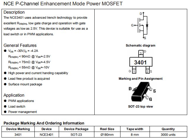鋰電池保護板一般選用30VMOS管,在這里給大家介紹下新潔能的增強型P溝道MOS管:NCE3401。其實適用的MOS管有很多例如:AO3401,IRLML5203TRDMP3098L-7都可以,為何選用新潔能的NCE3401呢?南山電子給大家分享下NCE3401的規格書,順帶給大家解答: