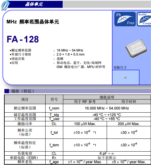 FA-128系列是一款MHz級AT切割方式的2016無源晶振(晶體諧振器)。具有尺寸小,功耗低,頻率穩定性好等特點。標準頻率:16MHz~54MHz,可供精度:10ppm/30ppm,負載電容:7pF/9pF/12pF等,工作溫度:-40℃ ~ +85℃/105℃。激勵功率:1µW~100µW,FA-128這款2016無源晶振可以用于移動電話,藍牙,無線-局域網,ISM 頻段電臺廣播,MPU時鐘等,下面給大家分享下這款2016無源晶振規格書以供大家選型參考: