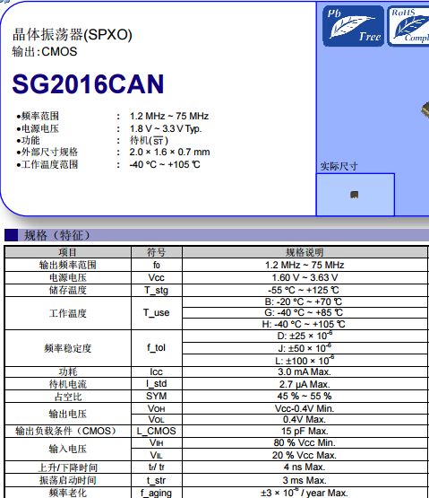 EPSON推出的2016有源晶振:SG2016CAN,是一款CMOS輸出的晶體振蕩器。頻率穩定度可達±50PPM,頻率老化度僅為±3PPM/year,具有較高的穩定性,滿足光模塊長期使用的要求。SG2016CAN封裝小,尺寸為2.0mm×1.6mm×0.7mm,光模塊體積小,采用2016有源晶振,更容易PCB設計。SG2016CAN的工作溫度范圍:-40℃~105℃,具有較高的工作溫度。5G前傳光模塊中,一般需要選擇寬溫的工作期間,所以所需的2016晶振也需要更高的溫度范圍,使用SG2016CAN可以滿足光模塊高溫的需求。下面南山電子就給大家看下這款2016有源晶振的規格書,以供大家選型參考: