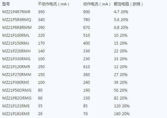 3、MZ2系列PTC熱敏電阻:是PTC限流型熱敏電阻,靈敏度較高,其電阻溫度系數要比金屬大10~ 100倍以上,能檢測出10-6°C的溫度變化:工作溫度范圍寬,常溫器件適用于- 55%C ~ 315°C ,高溫器件適用溫度高于315°C (目前較高可達到2000°C) , 低溫器件適用于-273C~55°C ;應用于變壓器保護產品的限流型PTC熱敏電阻主要型號如下圖所示: