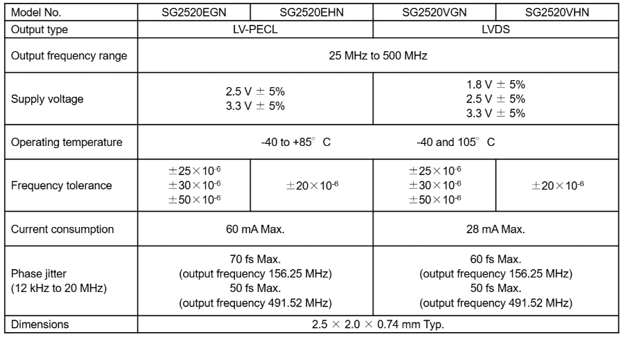 輸出:LV-PECL(SG2520EGN ,SG2520EHN),LVDS(SG2520VGNSG2520VHN