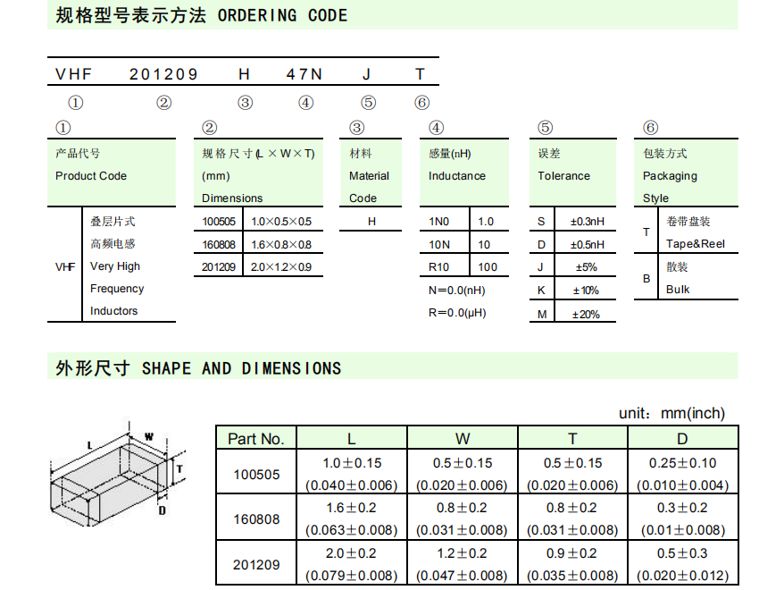 貼片高頻電感VHF201209H22NJT VHF160808H22NJT型號對比