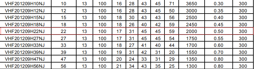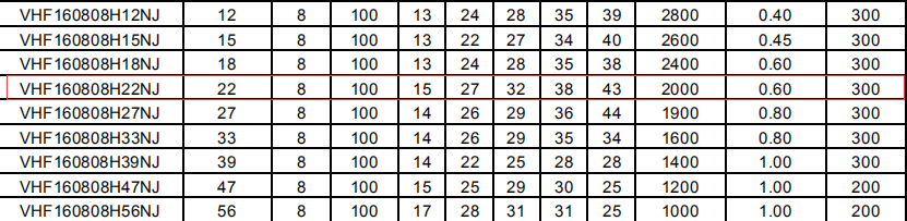 對比后發現,在測試頻率100MHz的情況下,兩者飽和電流均為300mA,VHF160808H22NJT的自諧振頻率Min2000MHz,直流電阻Max0.6Ω,VHF201209H22NJT的自諧振頻率Min1700MHz,直流電阻Max0.5Ω,所以說如果自諧振頻率在2000以上兩者都可以,在1700—2000MHz時,只能用VHF201209H22NJT。