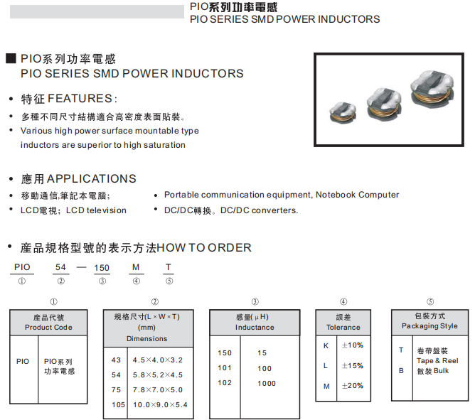 PIO貼片功率電感,PIO功率電感規格選型資料