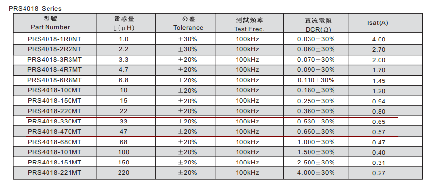 33uh電感是比較熱門的電感之一,33uh功率電感更是市場上最常用的功率電感之一。臨近19年元旦了,我們南山電子也開始盤點庫存,分析元器件今年出貨情況,發(fā)現(xiàn)33uh功率電感銷量較大的是PRS4018-330MT,說到這款33uh功率電感,讓我想到前段時間,我們上海的一個客戶,一直都用PRS4018-330MT,也是因為我們33uh功率電感前陣子出貨較多,他們又上個月在已經(jīng)給他們備了貨情況下,新增30K的貨,因為他們是終端,有好幾個技術人員,所以我們就讓他們自己根據(jù)規(guī)格書換適合的功率電感,他們選擇了相同規(guī)格的PRS4018-470MT,我們就發(fā)貨了,可是發(fā)貨后,他們采購跟我們這里溝通將PRS4018-470MT退了回來,原來他們一個新來的技術搞錯了,PRS4018-470MT電流不夠,只能等我們調(diào)回原來的33uh功率電感。接下來南山半導體就來給你分析下原因,同時告訴大家如何選型: