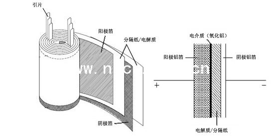 電解電容包含兩個導電電極,中間有絕緣層隔開。一個電極(陽極)由擴大了表面積的鋁箔形成。鋁氧化層(AL2O3)在其表面形成絕緣層。與其它電容相比,