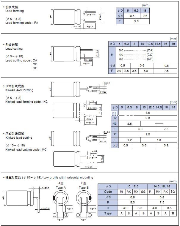 鋁電解電容器封裝按安裝方式分類有以下幾種:引線型、牛角型、貼片型、螺絲型等;按本體形狀分類由于其結構特點決定了常用的就只有圓柱形一種。常用的為標準引線型。