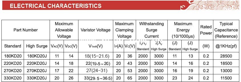 V1mA ——在1mA 測試下的壓敏擊穿電壓;IMP 8/20μ S 最大雷擊電流指標;