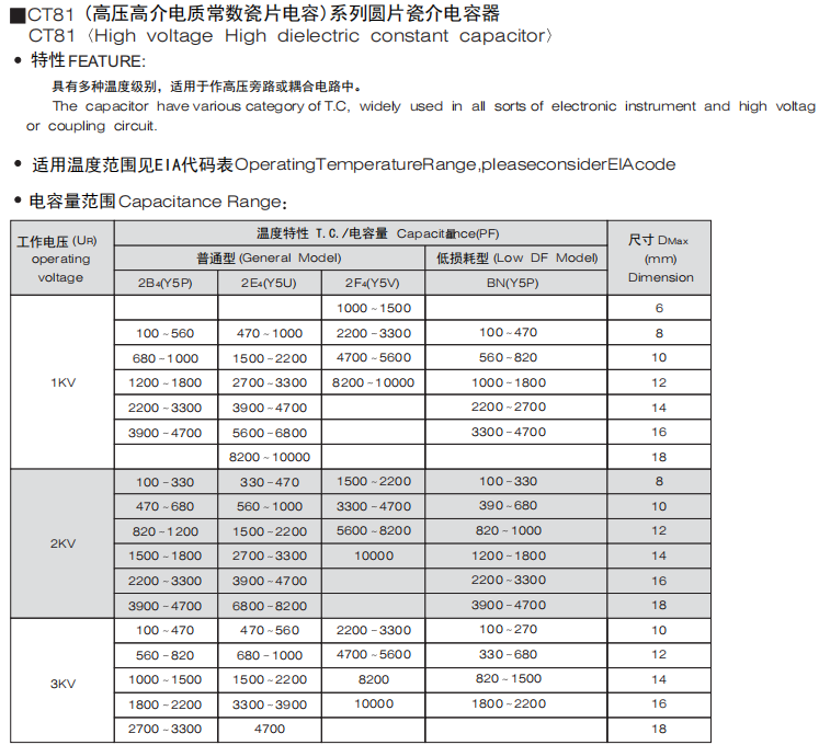 下面就給大家分享下風華CT81類型高壓瓷片電容的具體規格參數: